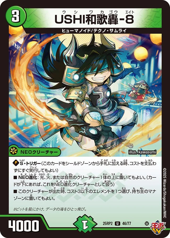 - このクリーチャーが攻撃する時、自分の山札の上から2枚をマナゾーンに置いてもよい。